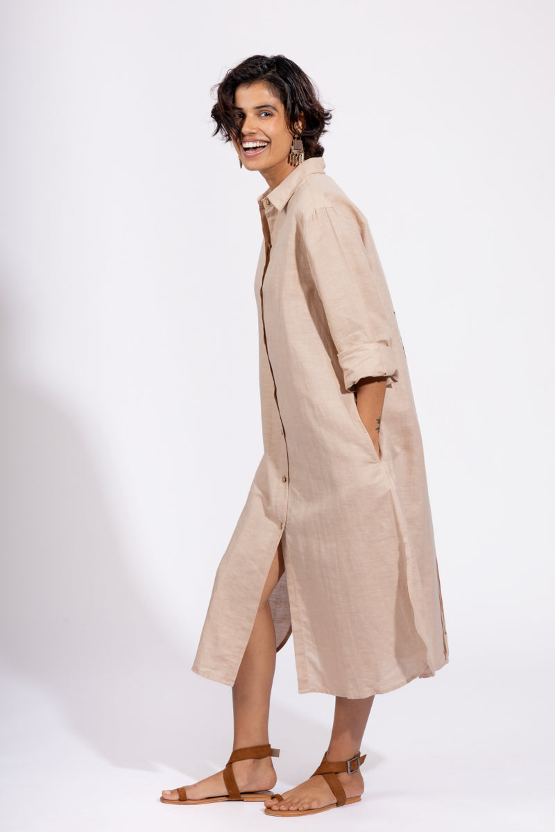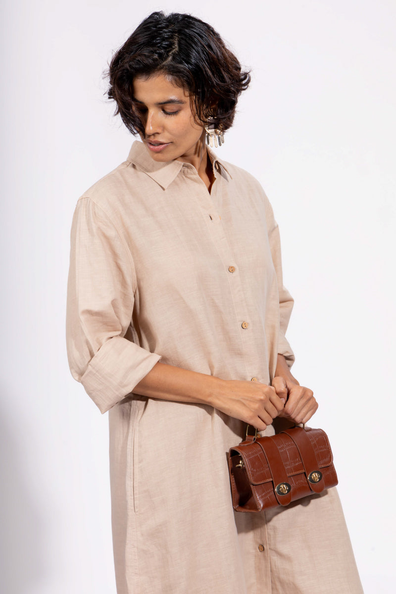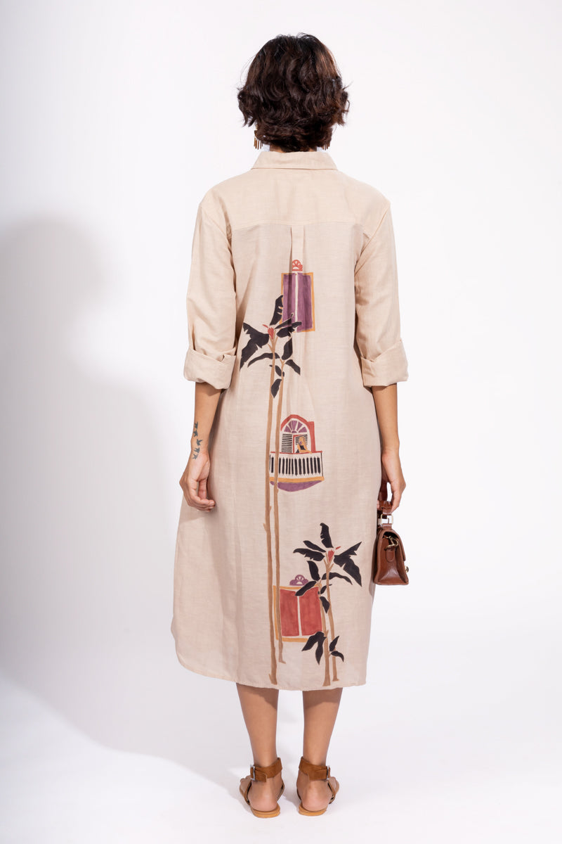 The coffee colour shirt dress beautifully embodies the Goan susegad spirit. Tall, graceful palm and banana trees, towering over the building, framing the view, creating a perfect blend of nature and tranquility. It invites us to embrace moments of calm and connection with our surroundings and cherish the peaceful downtime.