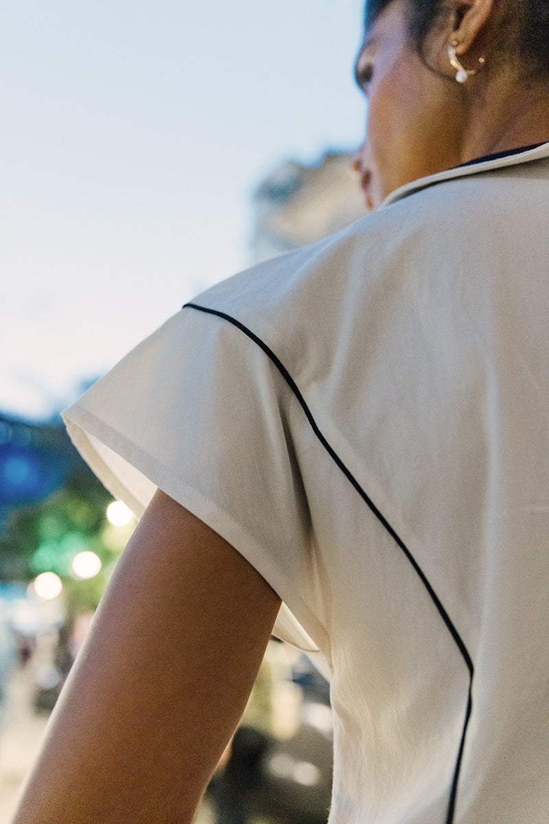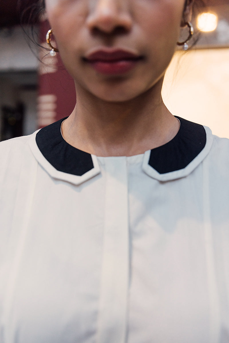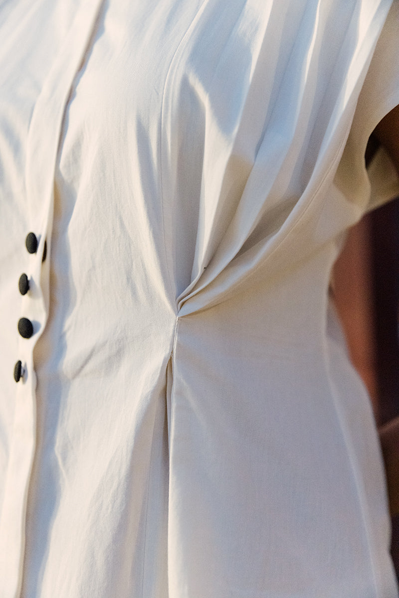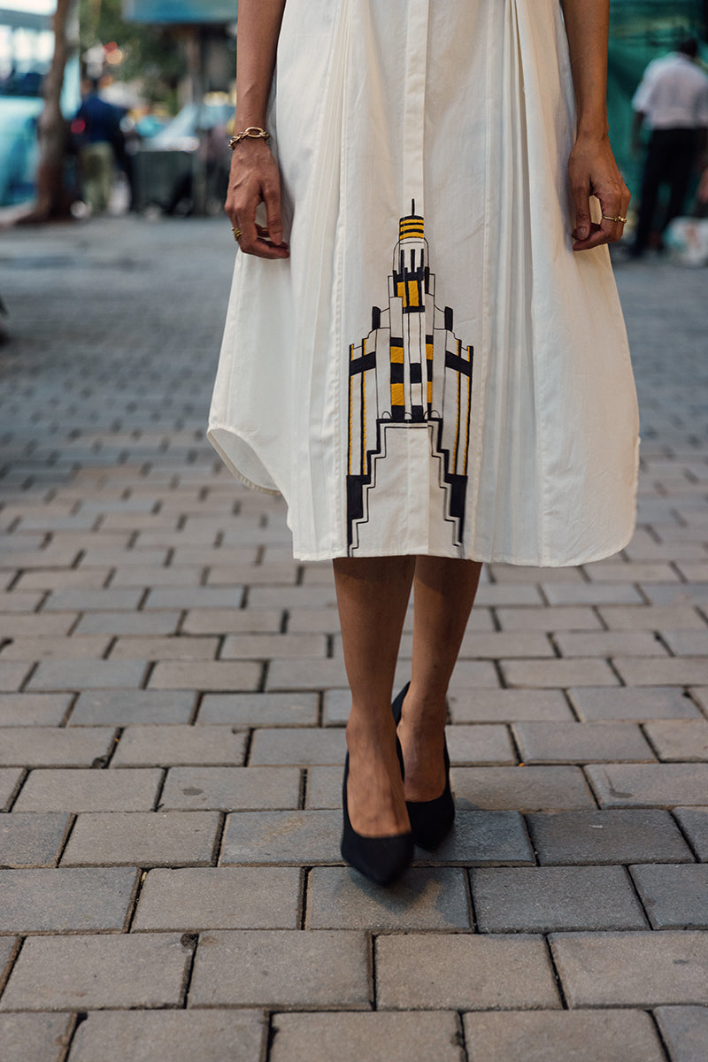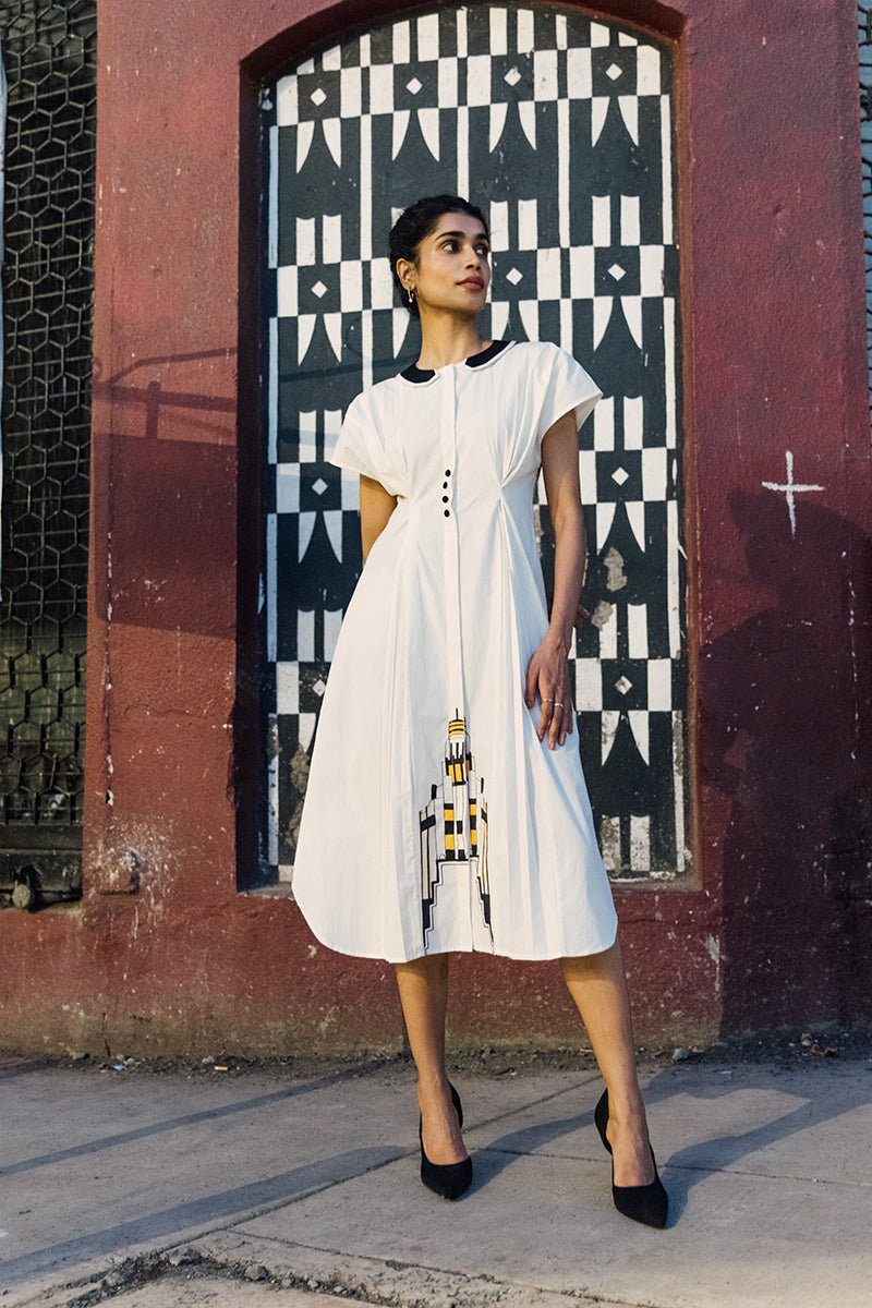 A tribute to the timeless elegance of Bombay’s Art Deco era, the Eros Dress draws inspiration from the iconic Eros Cinema building, while soft, flowing details reflect the quiet resilience of city life. Like the man moving through Bombay’s bustle on his cycle—balancing trays of fragile eggs with care and hope—this piece holds a story of grace, balance, and strength. An ode to the beauty that lives in both architecture and the everyday.