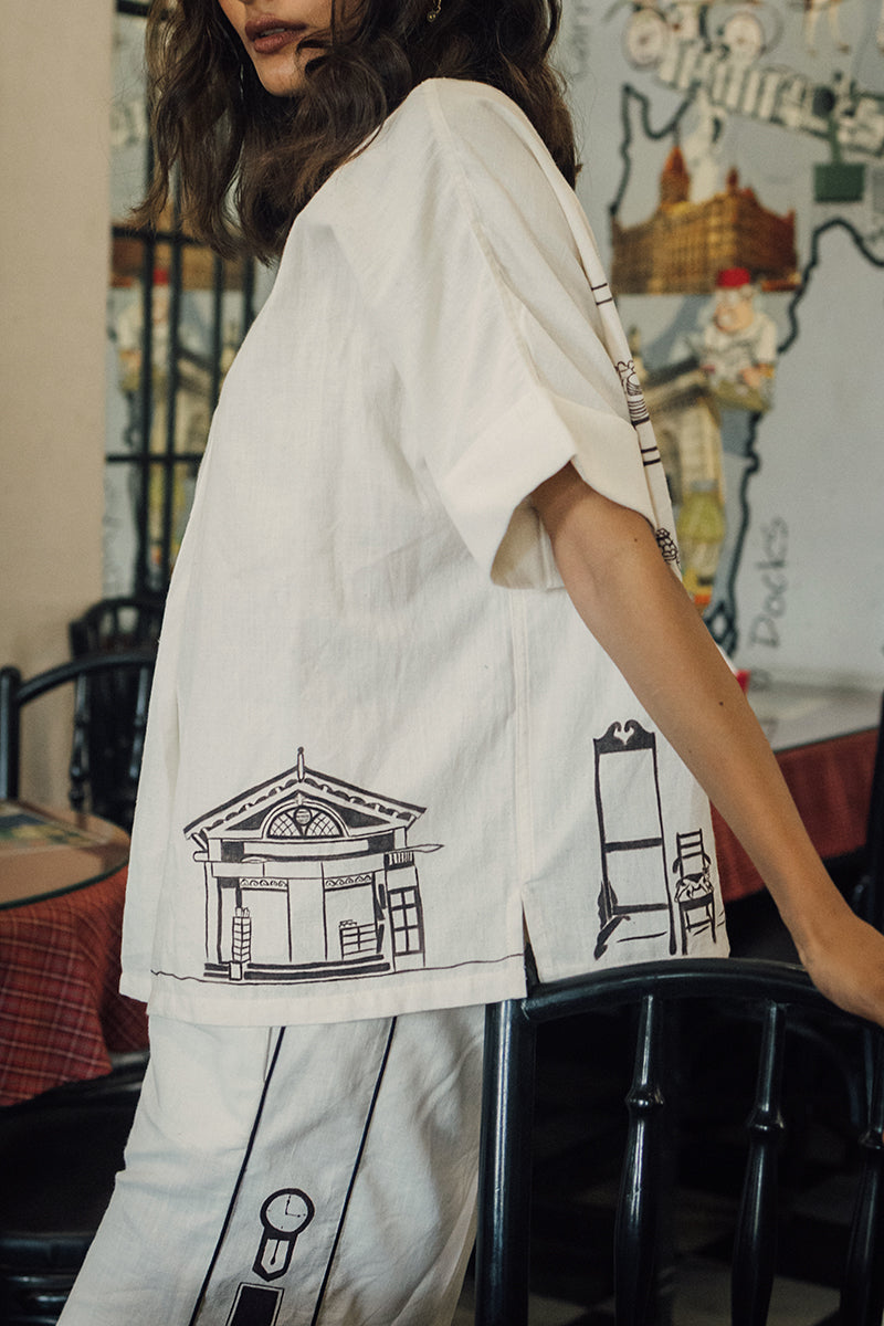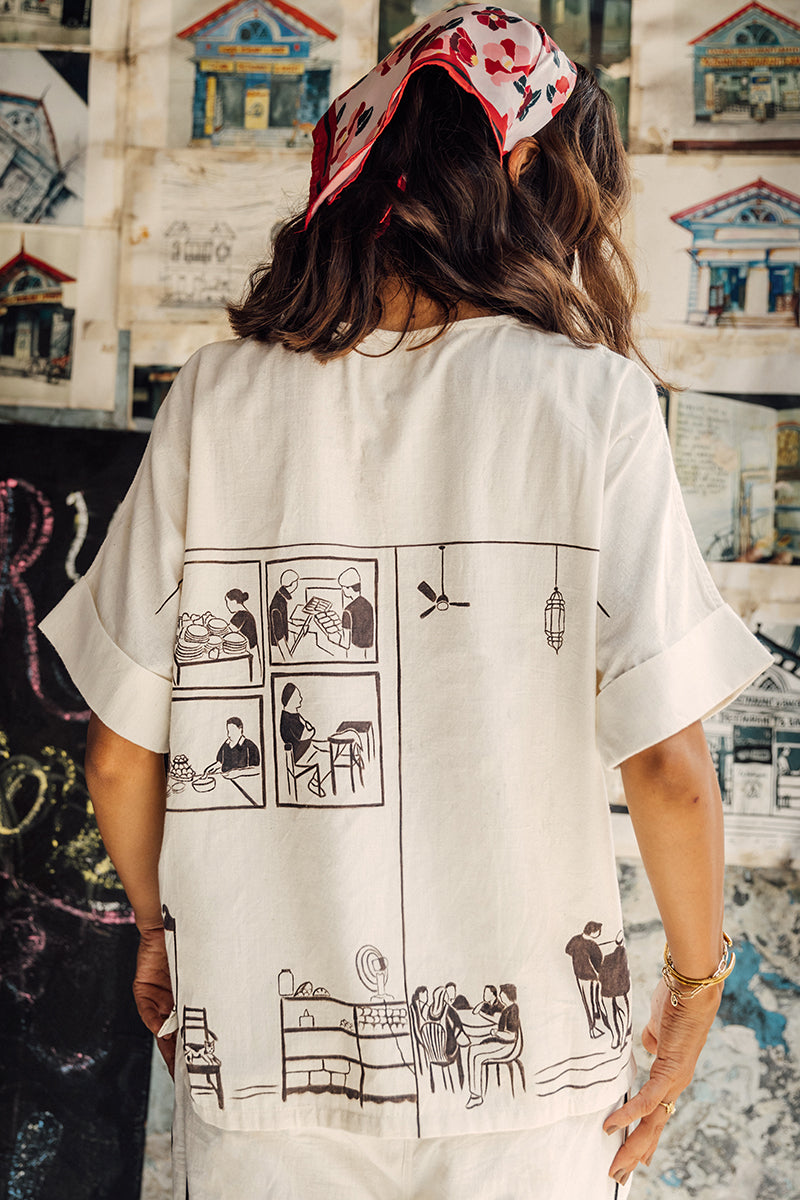 With hand-painted details in front and back, it feels like sitting among a thousand stories—of love, loss, and everyday life. Worn like a moment of stillness in a fast city, the Irani Top invites you to pause, linger, and belong.