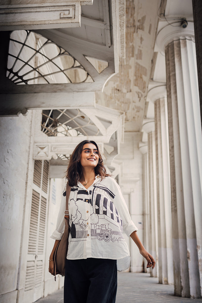 Hand-painted with motifs drawn from old libraries, winding staircases, and the textured stillness of yellowed pages, this shirt echoes the neoclassical calm of a place where time gently lingers. It evokes the memory of thinkers seated on stone steps, of manuscripts cradled by curious hands, and of Bombay before it became Mumbai.