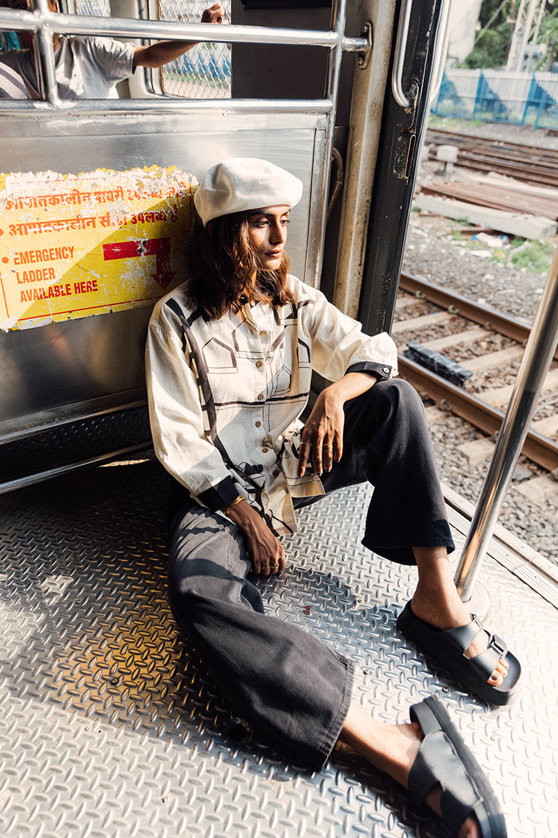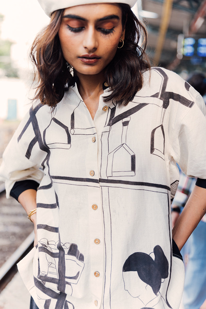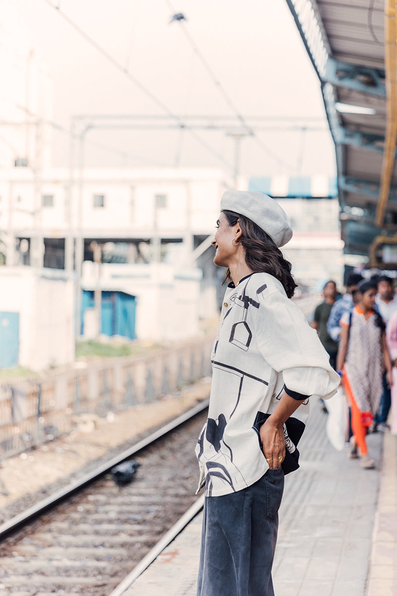 A tribute to Mumbai’s greatest storyteller—the Mumbai local train. The Railway Shirt is hand-painted with the rhythm of the city, where every compartment carries a slice of life and every journey becomes a shared tale. Look closer and you’ll find moments—voices raised in banter, songs born from strangers, hands reaching out just in time.