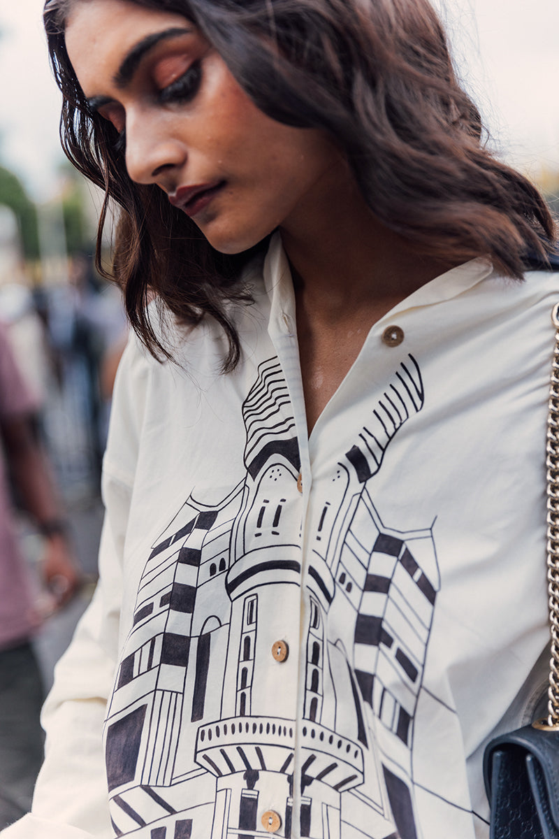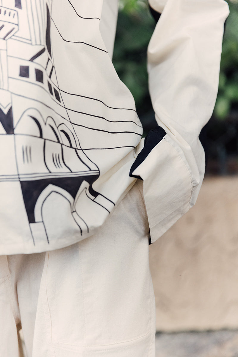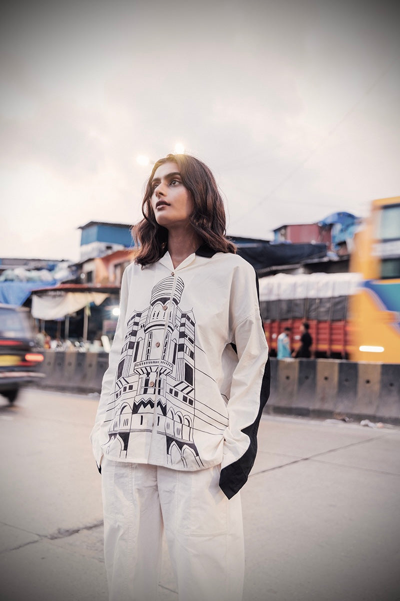 A tale of two Bombays—hand-painted in one shirt. The Taj Shirt brings together the grandeur of the first Taj Hotel with the resilience of Dharavi’s lived reality. On the front, clean lines and a hand-painted Taj reflect structure, pride, and legacy. Turn around, and the back tells a different story—raw edges, a tie-up detail, and hand-drawn homes that speak of ingenuity and survival. Just 12 km apart, these two worlds exist side by side. This shirt is a reminder of the contrasts we carry, and the strength that binds them.